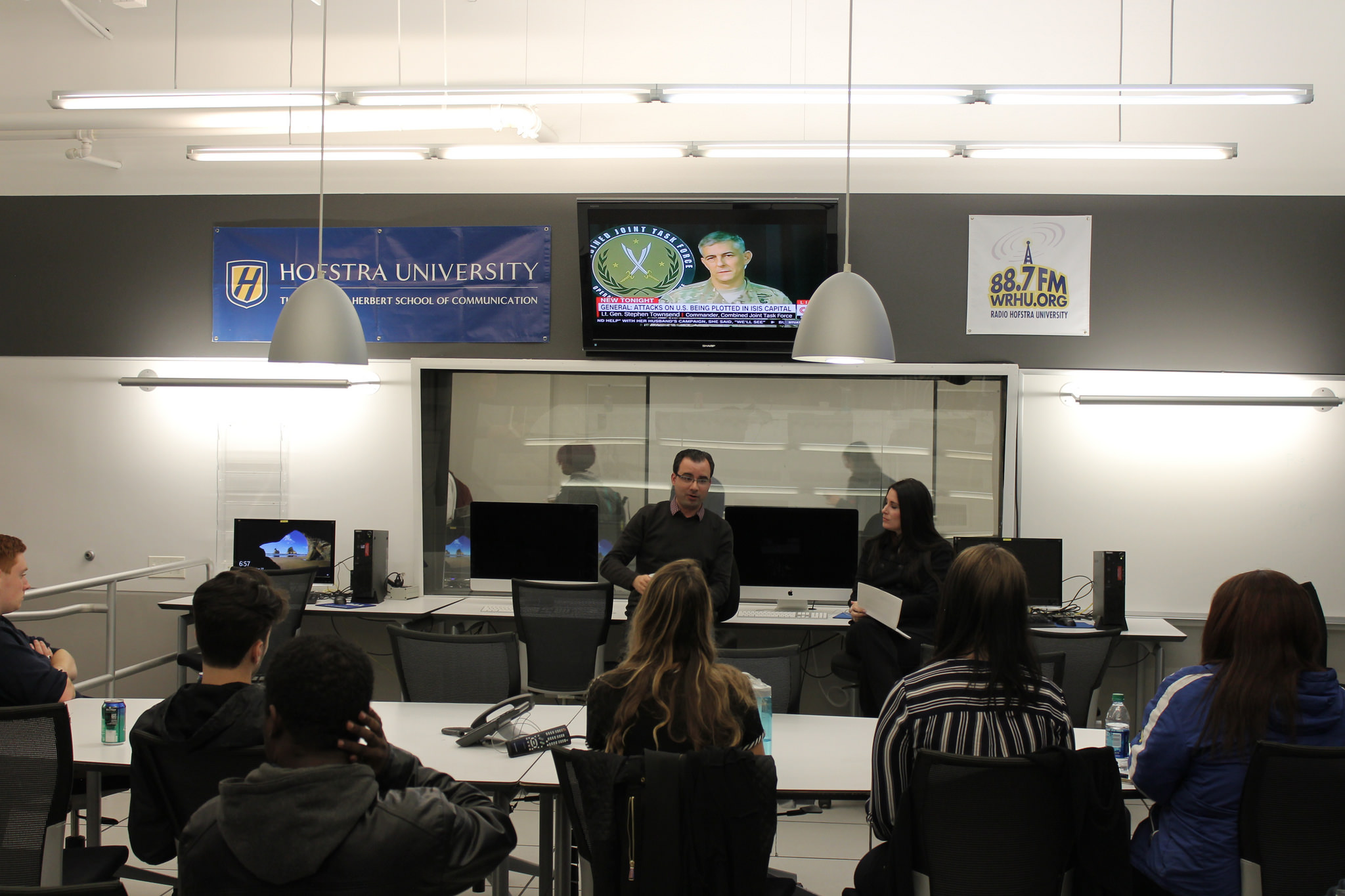 Heather Cohen moderates a Hofstra University Speaker Series session about radio programming development and operations with Chris Oliviero, Executive Vice President of Programming at CBS Radio, Oct 27, 2016.