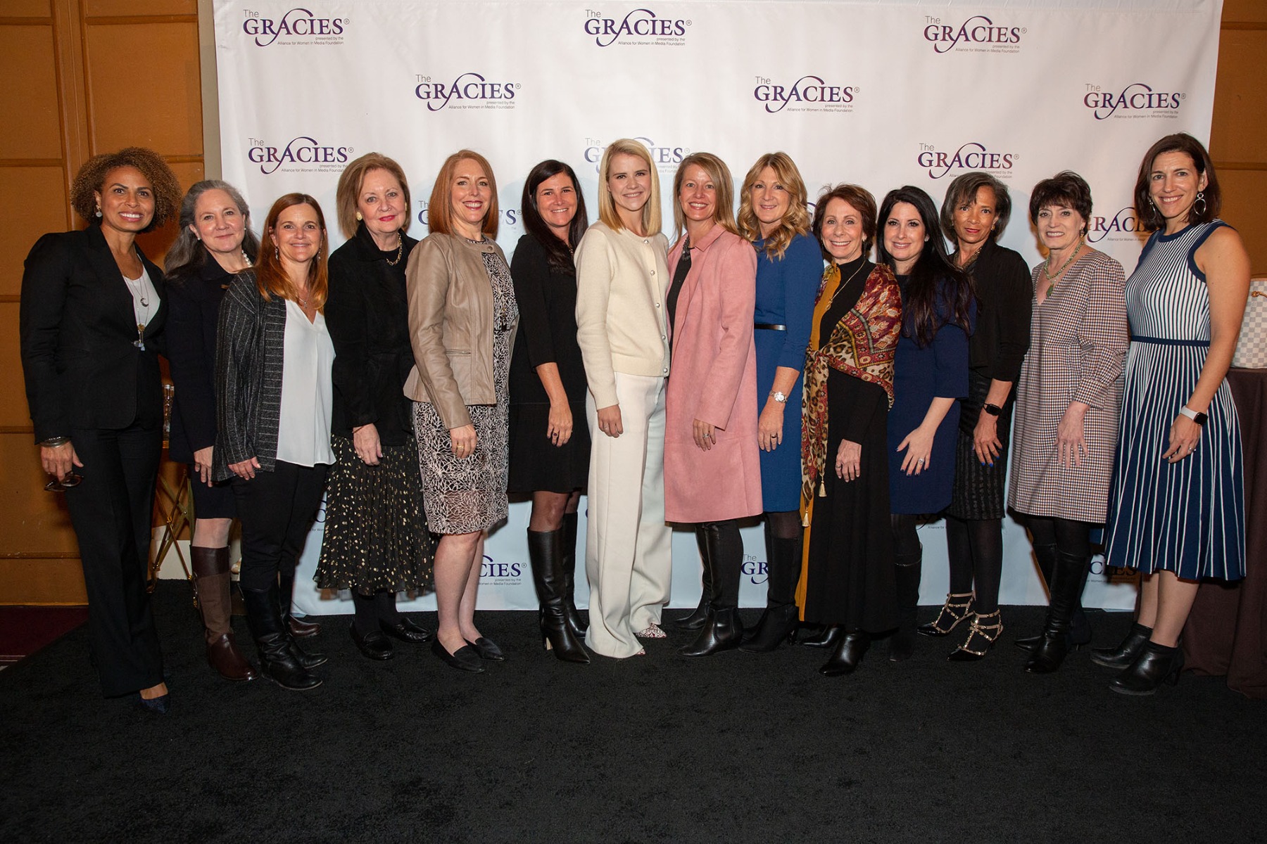 Heather Cohen (4th from R) with Elizabeth Smart (center) and the board of the Alliance for Women In Media at the 2019 Gracies Luncheon, New York.