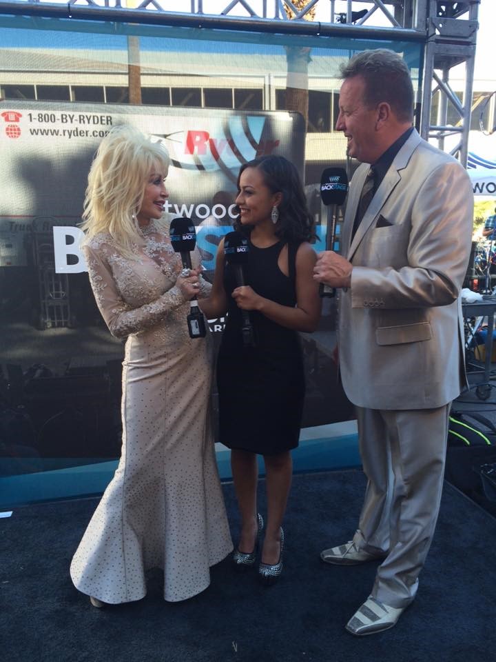 Dolly Parton with NASH Nights Live Co-Hosts Shawn Parr and Elaina Smith on the 51st Academy of Country Music Awards Red Carpet