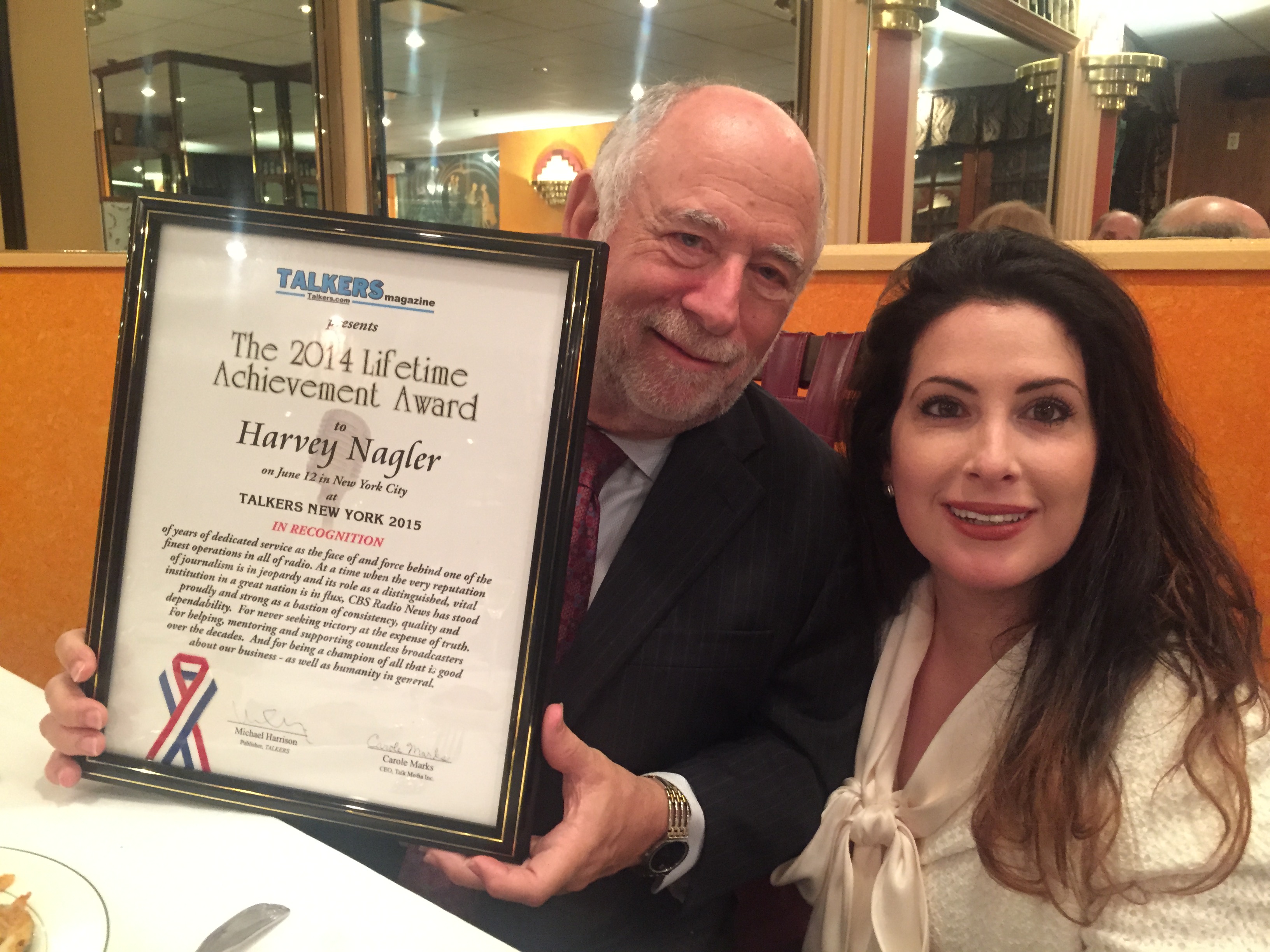 Heather Cohen and Harvey Nagler with his Talkers Lifetime Achievement Award, presented by Heather in June 2015