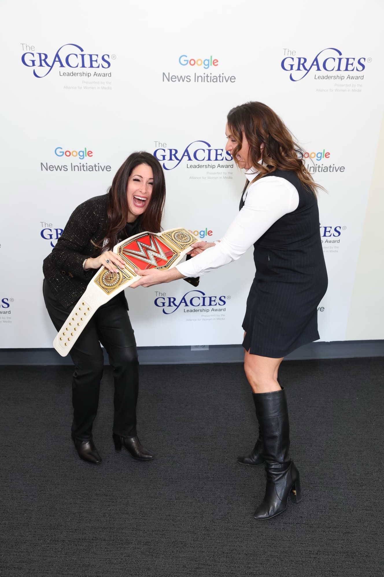 Heather Cohen is presented with her own WWE Women’s Championship belt by Stefanie Fiondella, WWE Vice President of Communications