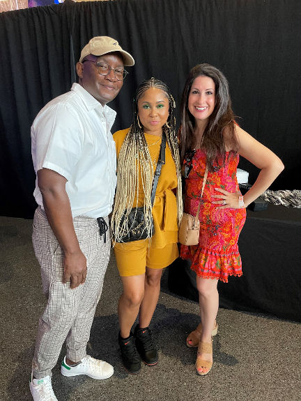 Angela Yee with Heather Cohen and Eric Weiss at the 2023 NAB Convention in Las Vegas, NV.